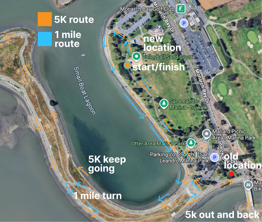 - WHERE: 14001 Monarch Bay Dr, San Leandro, CA 94577 (The Volleyball Sand Court is where the start/finish line will be.)